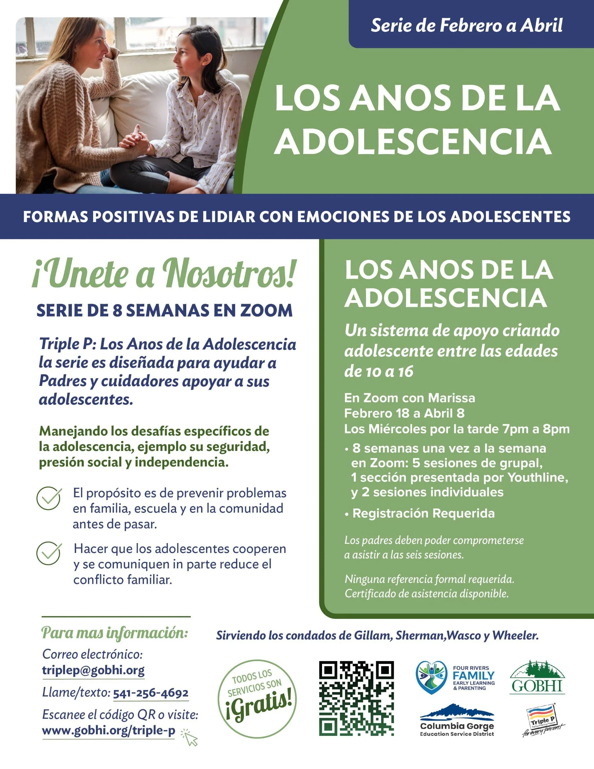 📩 Regístrese por correo electrónico, llamada/texto o escanee el código QR. Acompañar a un adolescente es un gran trabajo—estamos aquí para apoyarle. 💚